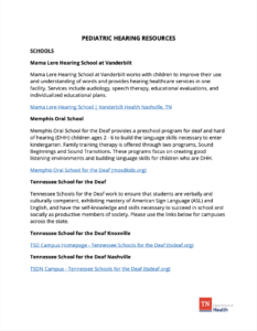 A comprehensive guide of pediatric hearing resources for families, including information about schools, family support, medical providers, language acquisition, hearing aid assistance, state resources, national resources, religious-affiliated camps, technology, assistive devices, and a glossary of terms created by the Tennessee Department of Health.